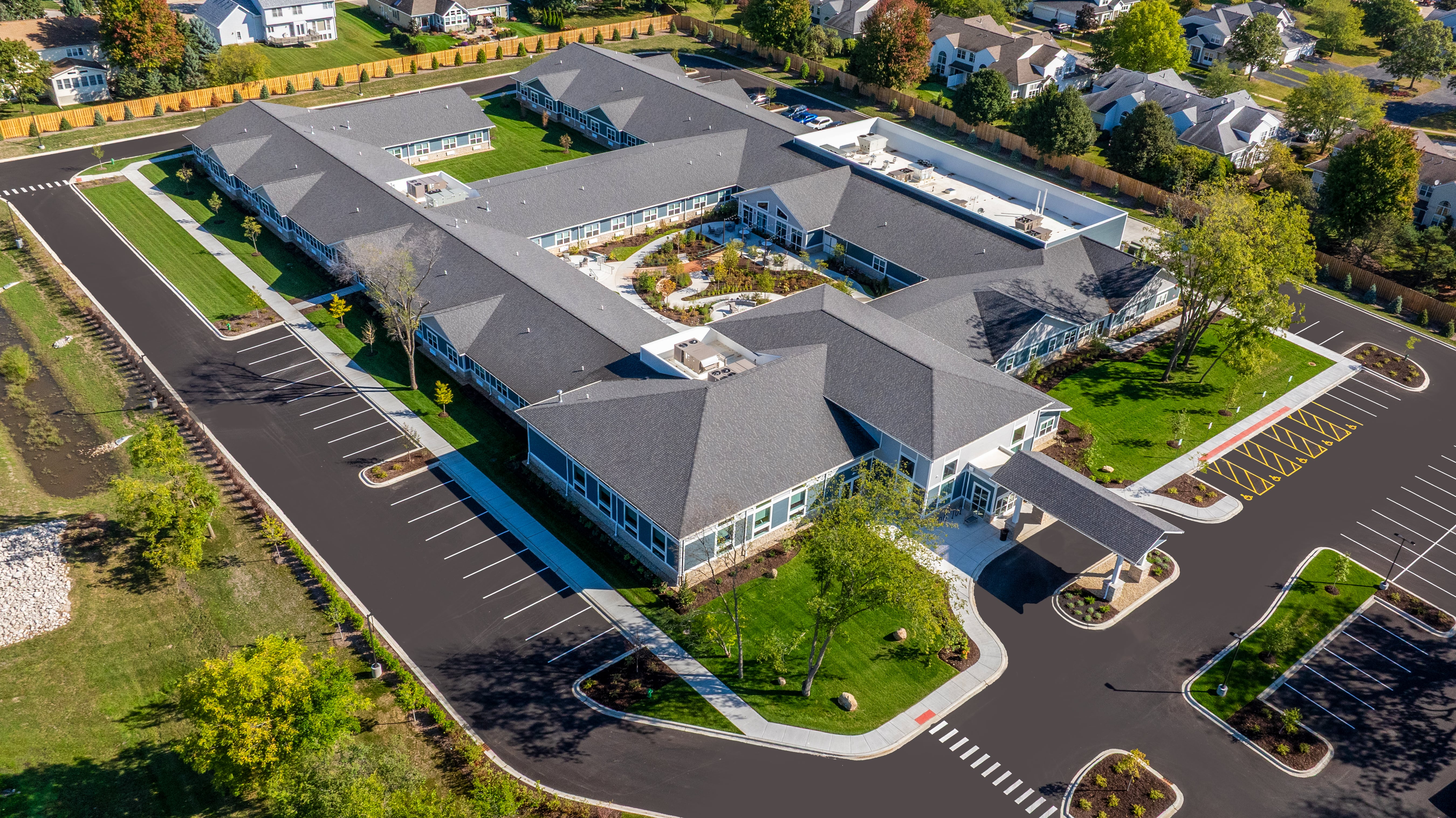 A single-story, 63,000-square-foot, wood-framed structure designed for skilled nursing and rehabilitation, featuring 78 units and 96 beds. The facility includes physical and occupational therapy rooms, a salon, a chapel, dining rooms, a bistro lounge, a café, outdoor dining areas, an outdoor covered rehabilitation space, activity rooms, and lounges.